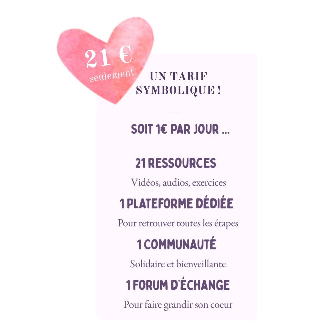 Ce programme est un parcours d'auto-coaching de 21 jours conçu pour vous accompagner dans vos objectifs de développement personnel . Chaque jour, accédez à de nouvelles ressources telles que vidéos, audios et exercices de coaching.