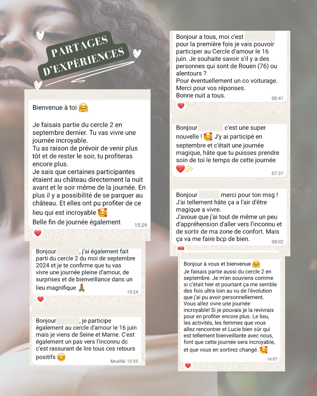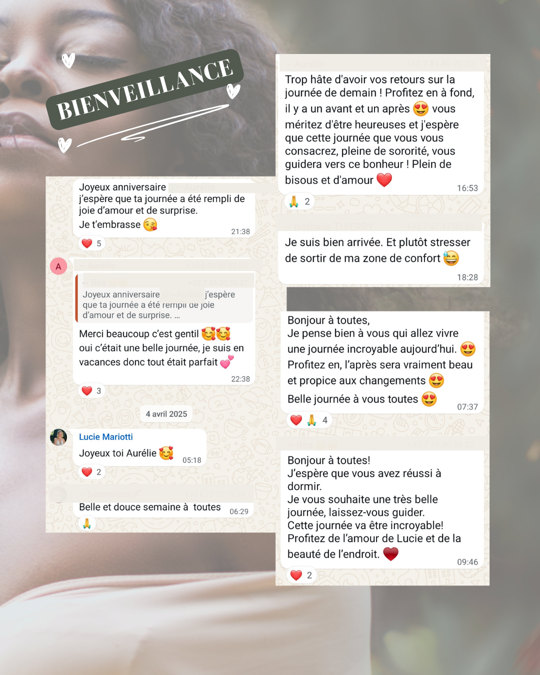 Cet événement n'est pas seulement une journée hors du temps, baignée de sororité et d’amour, c'est une véritable métamorphose. Vous arriverez peut-être avec des angoisses, des blocages, des souffrances …