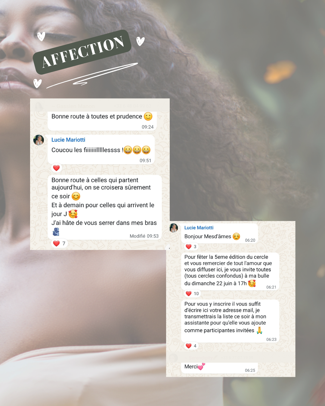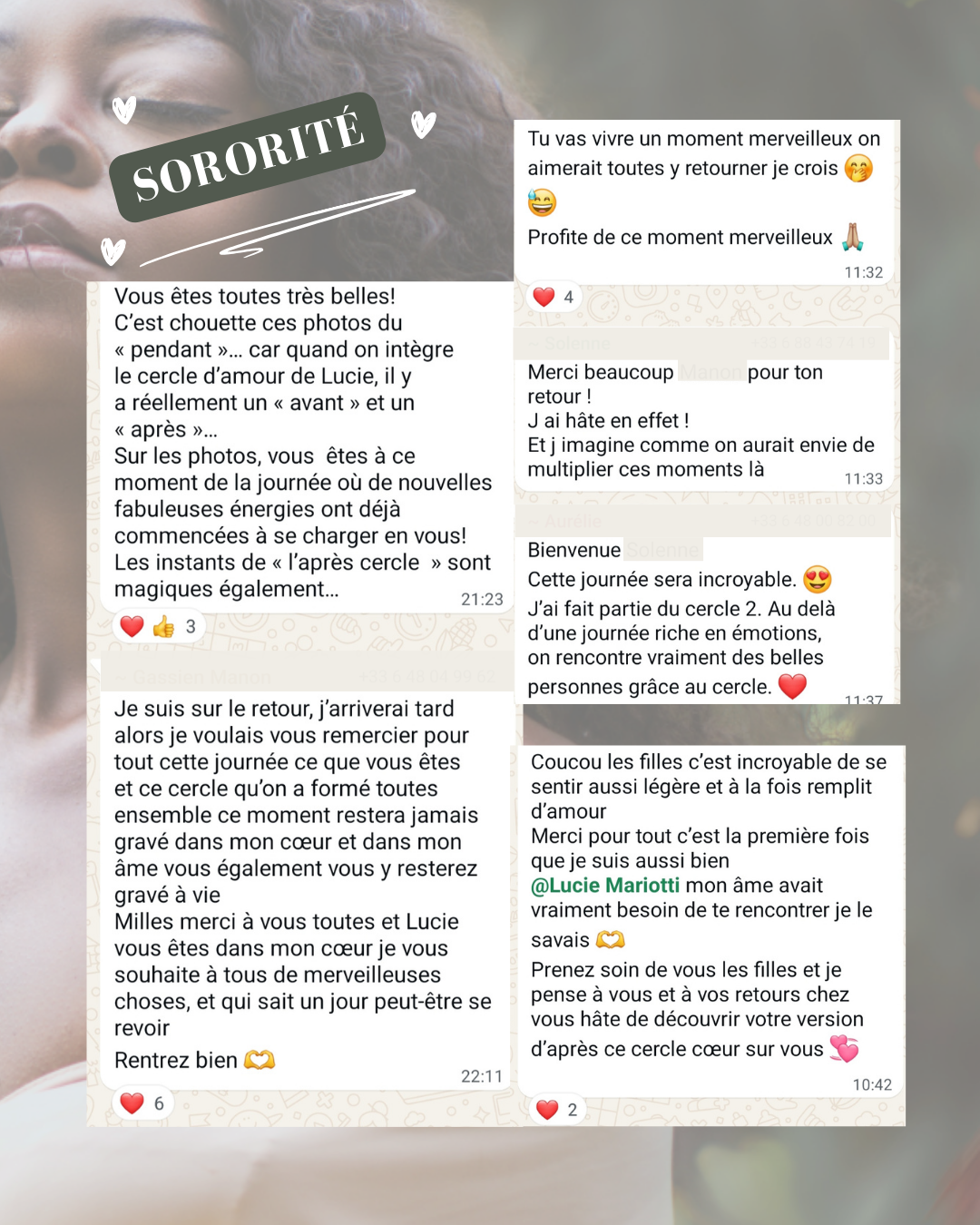 Le Cercle d'Amour de Lucie est un événement exclusif et intime, réservé à un groupe restreint de seulement 8 femmes. Conçu pour vous offrir l'élan nécessaire à une transformation profonde dans votre parcours de développement personnel, il vous guide vers l'amour absolu. Sous la guidance bienveillante de Lucie Mariotti, cet espace unique vous permettra de franchir un pas décisif vers la résilience, le soin, l'épanouissement personnel, et l’amour.